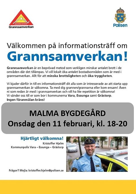 Informationsträff i Malma onsdag den 11 februari kl 18.00-20.00 Polisen bjuder in kommuninvånarna, ingen föranmälan krävs.