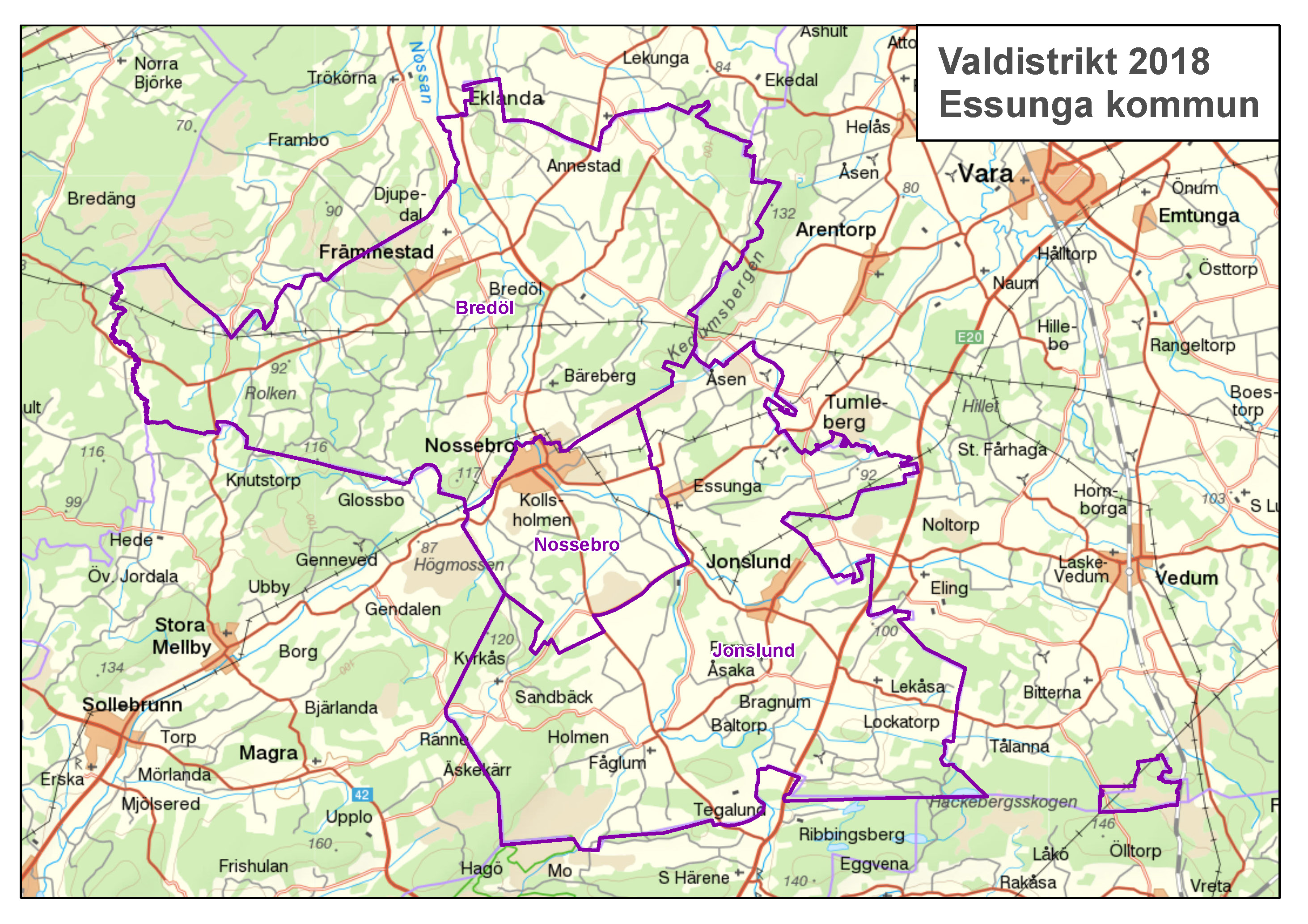 Essunga kommun är indelat i tre valdistrikt. Ett valdistrikt är ett geografiskt område och brukar bestå av mellan 1 000 och 2 000 röstberättigade.