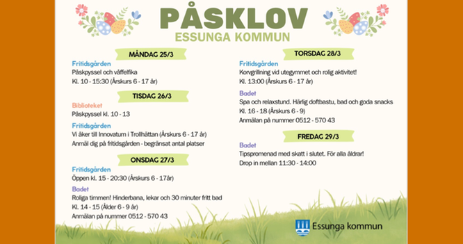 Under vecka 13 är det påsklov. Nedan har vi sammanställt aktiviteter på Nossebro bibliotek, badhus och fritidsgård. För mer tips från bland annat privata arrangörer besök vår evenemangskalender Länk till annan webbplats, öppnas i nytt fönster.. -